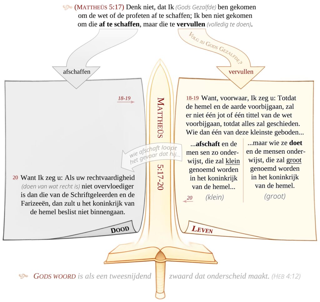 Hoe denk jij erover, wanneer volgelingen van Christus óók de kleine geboden doen en anderen daarin onderwijzen? Zeg jij in navolging van Christus: “Die zullen groot zijn in Zijn Koninkrijk”? De Joden dachten niet alleen aan de tien geboden toen Jesjoea deze woorden uit Mattheüs tegen hen sprak. Toen tegen het volk gezegd werd: “de wet en de profeten”, dachten ze aan de héle wet van Mozes en de profeten. De boodschap die het Joodse volk uit dit onderricht van Christus ontvingen was, dat niet één woord van de wet zal worden weggedaan, elk woord zal als wet blijven staan, tot het einde van deze wereld en de komst van Gods koninkrijk. Daarbij werd ook benadrukt door Jesjoea dat ze nauwkeurig moeten luisteren naar de wet met haar instructies in hoe rechtvaardig te wandelen, want hun zaligheid hangt er vanaf. Moeten mensen in een ander werelddeel, die 2000 jaar late zullen leven, dan wel gaan denken dat Christus naar deze wereld kwam om iets van de wet af te schaffen? Waarom zouden we niet geloven wat Christus heeft gezegd?